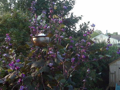 Purple hyacinth beans are my garden’s little freebie to me, a September gift that always arrives despite my yearly fears that this year the beans will fail. I planted them the first year or two, six or seven years ago now, and since then the steady rain of dried beans that falls from the porch where they grow onto a pretty vagrant piece of land below has resulted in this bit of garden grace.