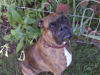 Otis, dearest of dogs, darling slobbery galumphing beast. There are a few things that are incompatible with gardening, I think: laziness, August afternoons in Maryland, and boxers.