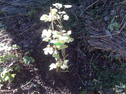 Can you see it? In five years or so a wonderful hedge will hide the decrepit back fence and the compost pile, and that hedge will bear gem-like fruit in jewel tones. Or it is so in my dreams, at least. If you look closely, you can see the currant babies, three of them (two red, one white, no further detail given), planted just at the shade line inside the vegetable garden, snuggling with the yet-to-be eaten cardoon.