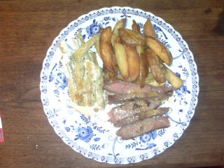 The gratin is hard to see, on the left, eaten with steak and oven fries. The gratin was quite good, with a distinct artichoke flavor, but still with a bitter hit that made it interesting. I’m not sure cardoons would ever make it onto my weekly vegetable rotation, which is all to the good, seeing as getting them onto a plate has been a six month project.