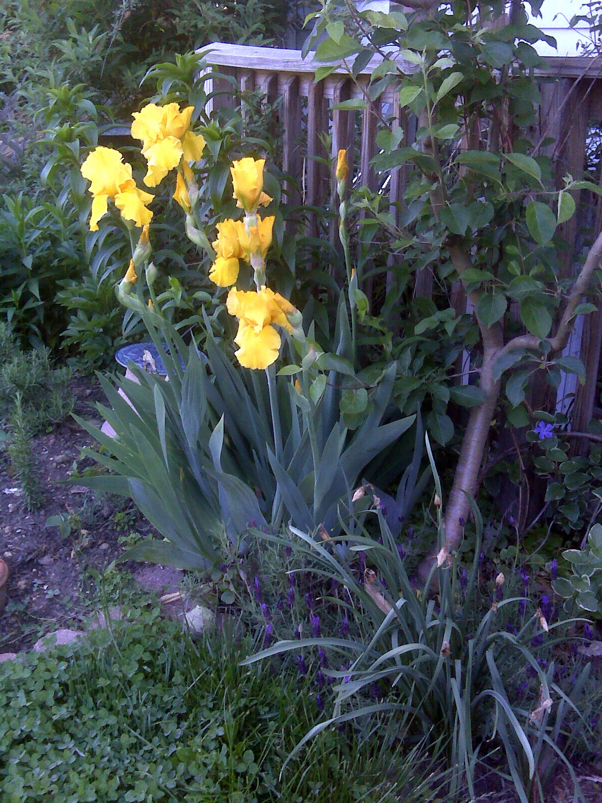 Iris, the quintisential May flower. Somehow I have yellow ones, but no purple. These flower spikes are over four feet tall, and just glorious. They also resist turning to mush in the rain, unlike the yellow and brown ones further down the bed. I should replace those with purple, and then May would be something to see.