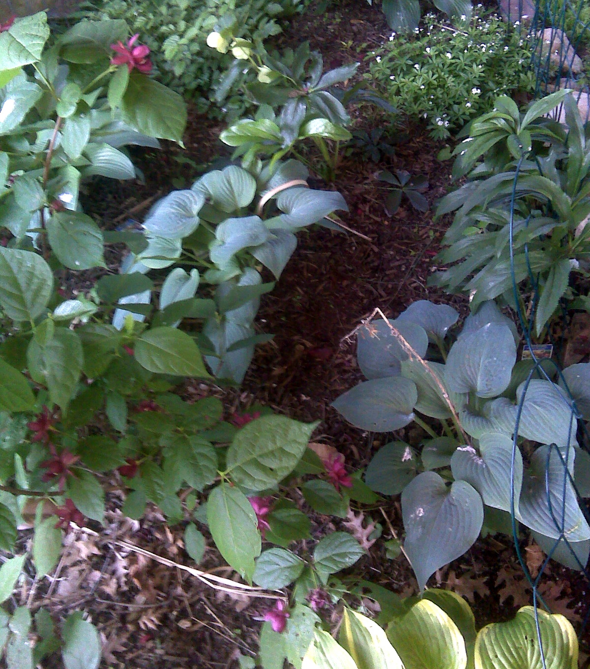 The shrub I planted has surprised me. It was labled as a Calycanthus something-or-other “white.” I expected white flowers. Nope. Wine red. You can see them above, just a bit, along with some heleabores, sweet woordruf, and hostas. Really, the surprises are the best.