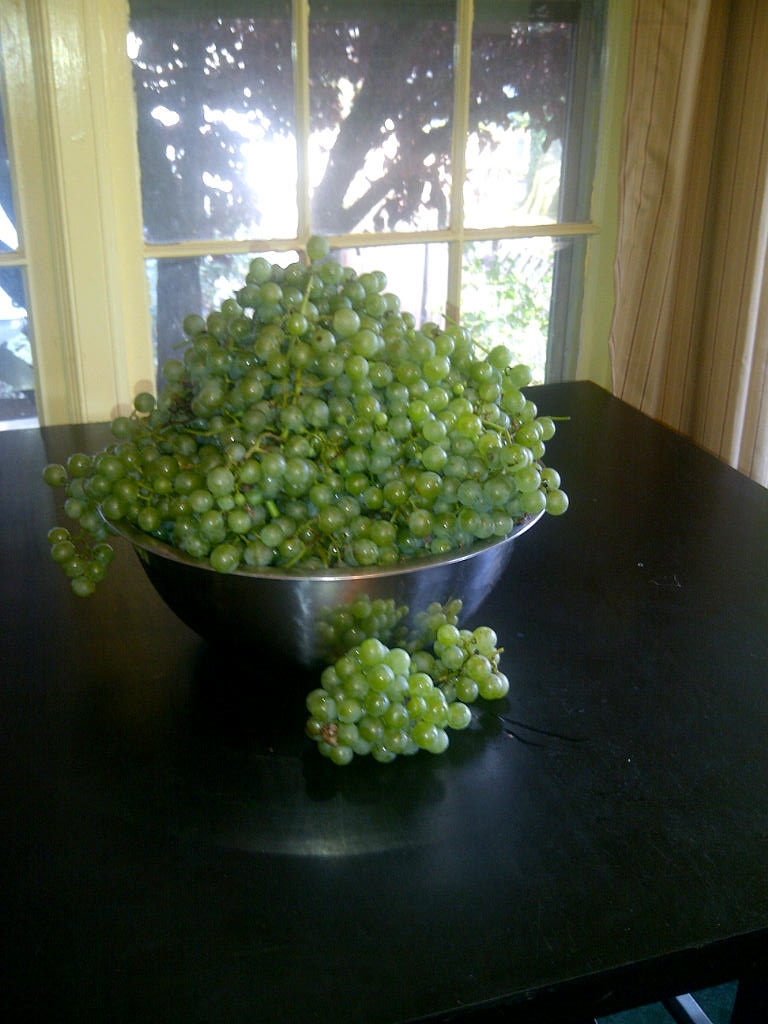 Yesterday I was whacking back weeds against the chain link fence, doing battle with the bindweed. And as I pulled the wicked stuff off the fence and grape vines…I found a gift. Pounds and pounds of beautiful clusters of grapes, the fruit of a vine I abandoned last year after it has refused to produce since its planting. I must have been putting too much pressure on the poor thing, because left to its own devices it climbed into the neighbor’s evergreen hedge and flourished. In order to harvest the grapes I simply tugged on the vines and cut them off the plant, and hauled armfulls of vines and fruit into the house.