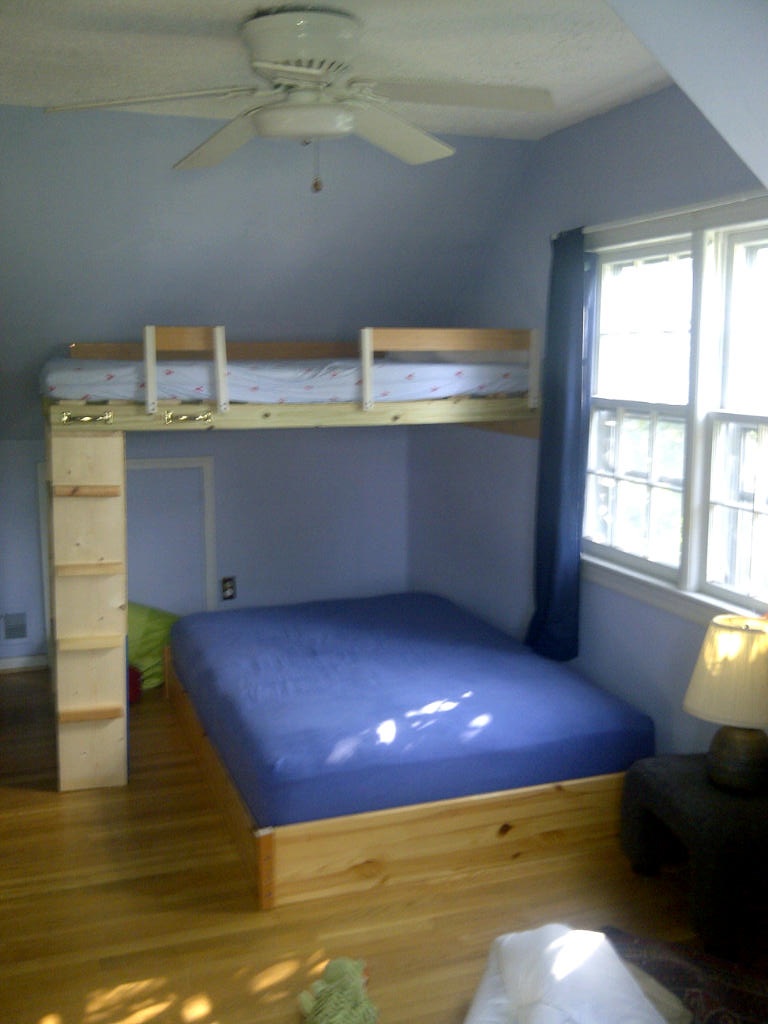 I have spent countless hours mulling this bed, and how to make it solid. I was amused to realize that if I had bought a cheapo bunk bed at Ikea I would not have thought for a moment about its safety. But this bed, which I have built by hand, I wonder about. I tied the two-by-four that holds up the wall-end of the bed to the studs with four four-inch lag screws, and both screwed and glued the beams to the two-by-four. The beams are held up by a book case made as solid as I know how, held together with screws and glue and a backing of half inch plywood. This is one weighty piece of furniture, as a pirate ship should be. And yet I lie on the bottom bunk, looking up at those beams, and imagine the whole crashing down in an earthquake with Noah below. But that would involve the whole house falling down, probably, so we’d all be in trouble anyway.