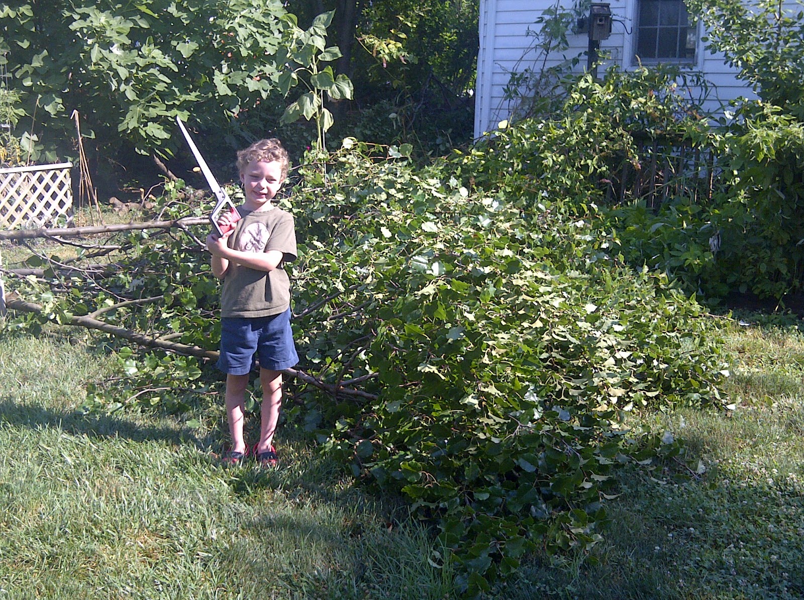 A derecho took out my tree. No, I had never heard of a derecho, either, but apparently it is a counterpart to a tornado – a strong fast storm that (unlike a twister) moves straight ahead. The storm knocked down half of the bradford pear tree, which fell perfectly between Noah’s bedroom and Noah’s pet sunflower. After some excavation we found Noah’s garden gnome unharmed beneath the wreckage. My lucky boy. I was not so lucky. The storm took out the bradford pear, the bradford pear took out an apple tree, and the apple tree took out my raspberries. All of that landed on my herb garden. We sawed the branches up and piled them by the fence awaiting the tree service to take down the rest of the tree and chip the whole mess, but the entire back yard now looks quite woebegone and battle weary. Too much heat, too much wind, not enough water.