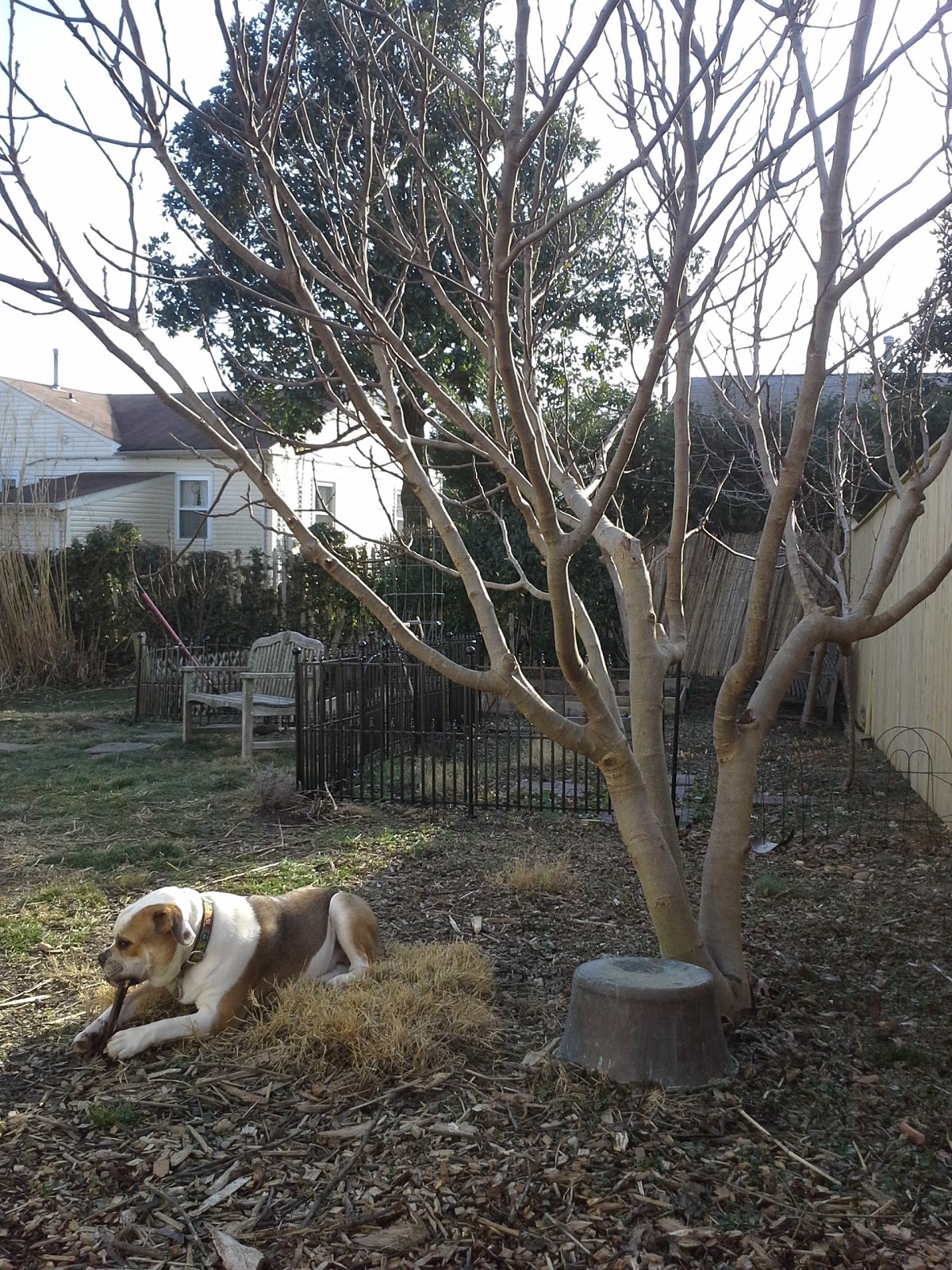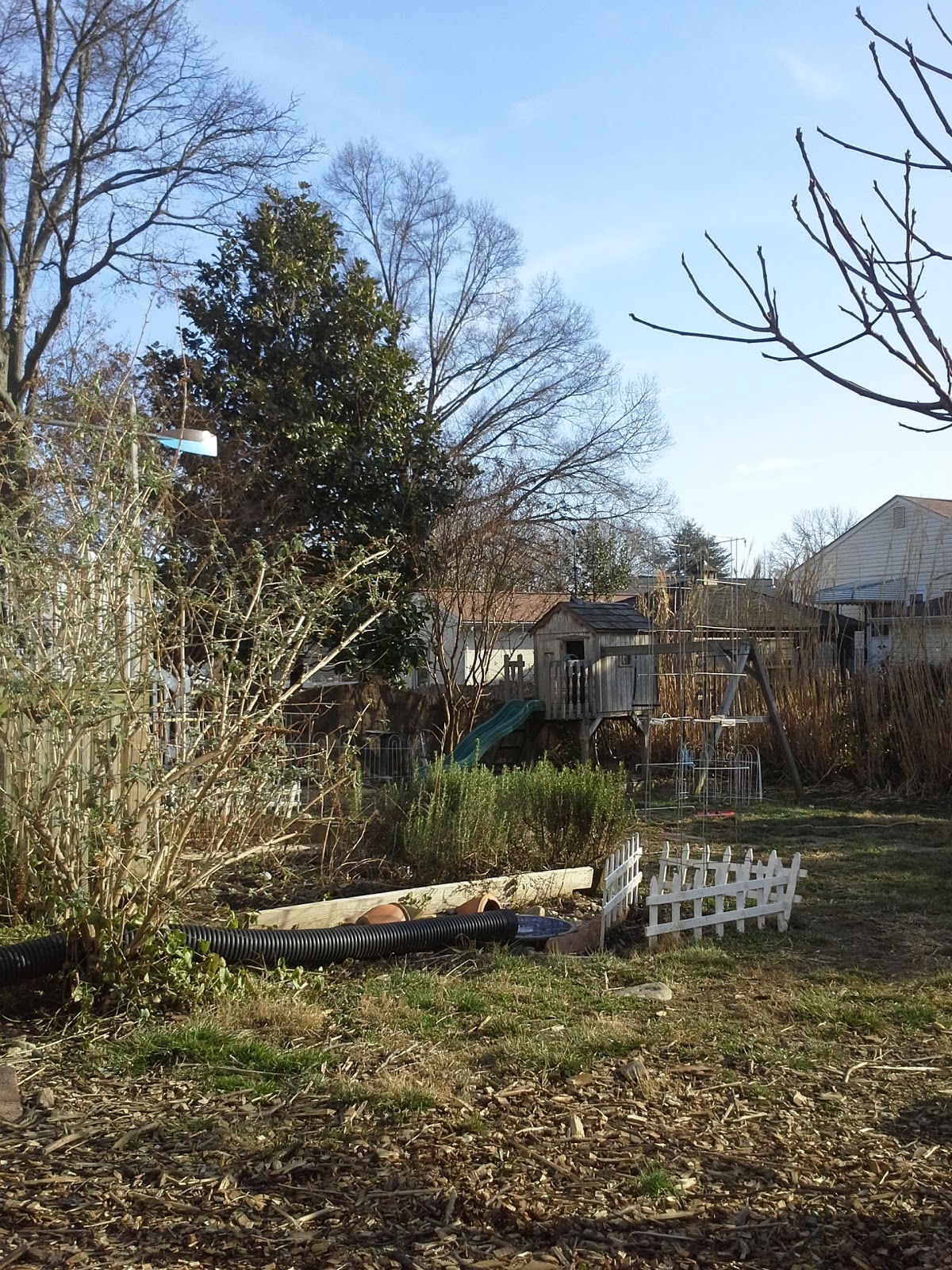 It was 65 degrees yesterday, and after a half hour of puttering in the garden I decided to just…sit.  It is a rare thing, this lounging in the garden, especially in January.  My new favorite spot in the garden is this tucked away corner between the fig tree and the gate spread with wood chips.  My chair is there, and there is a high solid fence on two sides and the house on the third, leaving you feeling very snug and secure and able to look out at the hubub of the rest of the garden and the neighbors beyond without feeling drawn into it all. Plus it is warm and sheltered in the winter and shady in the summer.