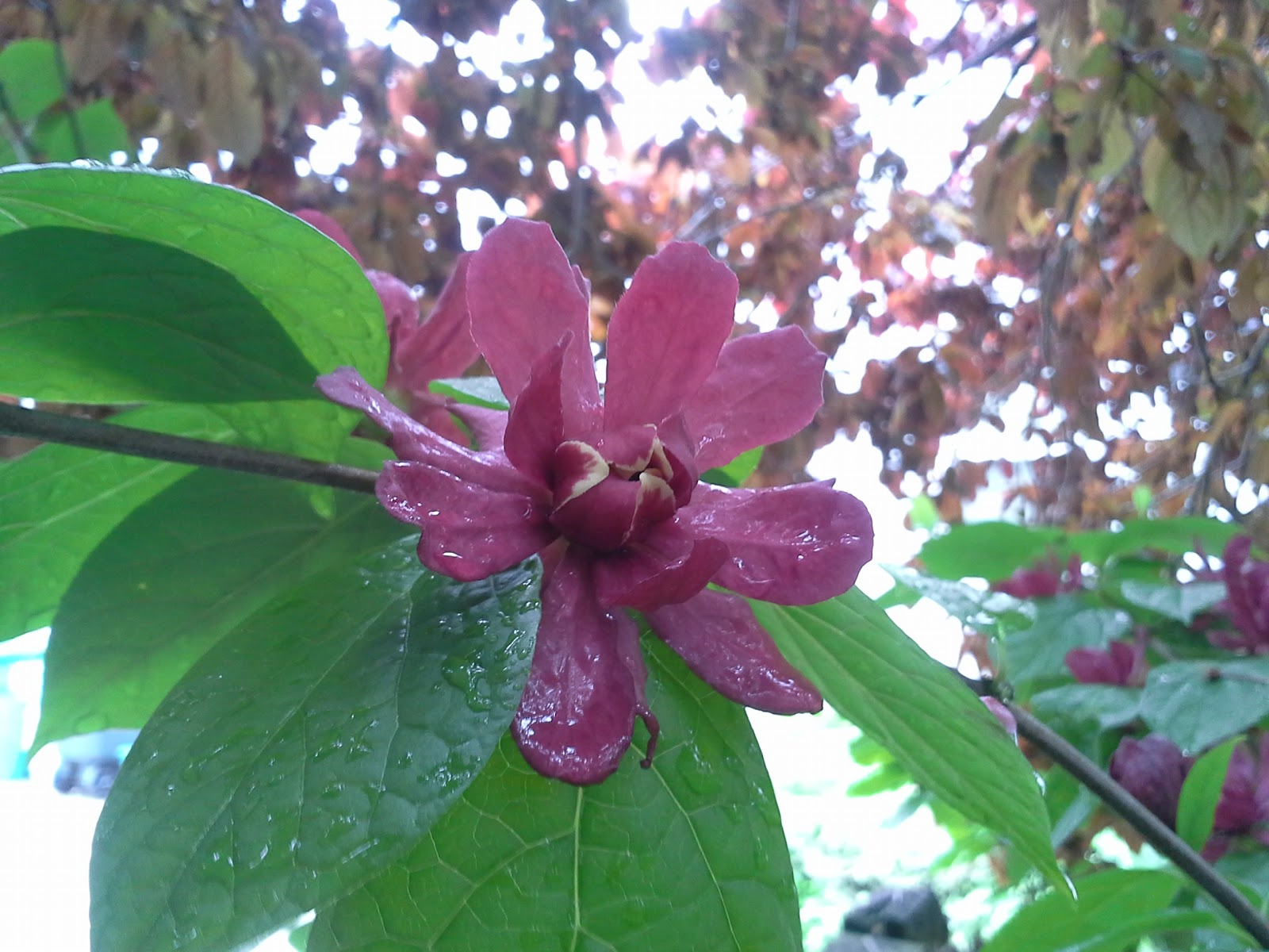The flowers of this shrub (I’ve already forgotten its name) have no scent that I can tell, but the flowers surprise me all the same, blooming with their blood red petals under a tree where all else is some shade of green, or maybe a demure white.