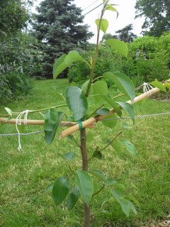Here is how one little pear looks with its soft little limbs tied down to stakes with kitchen string. The books said to try a 45 degree angle to start, and then to lower the stakes to horizontal in the fall.