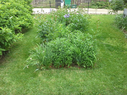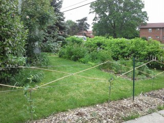 The espalier pears are growing, thankfully. I was worried I had taken off too much, and that they would die. But they are hardy little things, and are putting out growth on their remaining, uncut limbs. The photos above and below are the line of espalier from the neighbors’ driveway (above) and from my front walk (below)