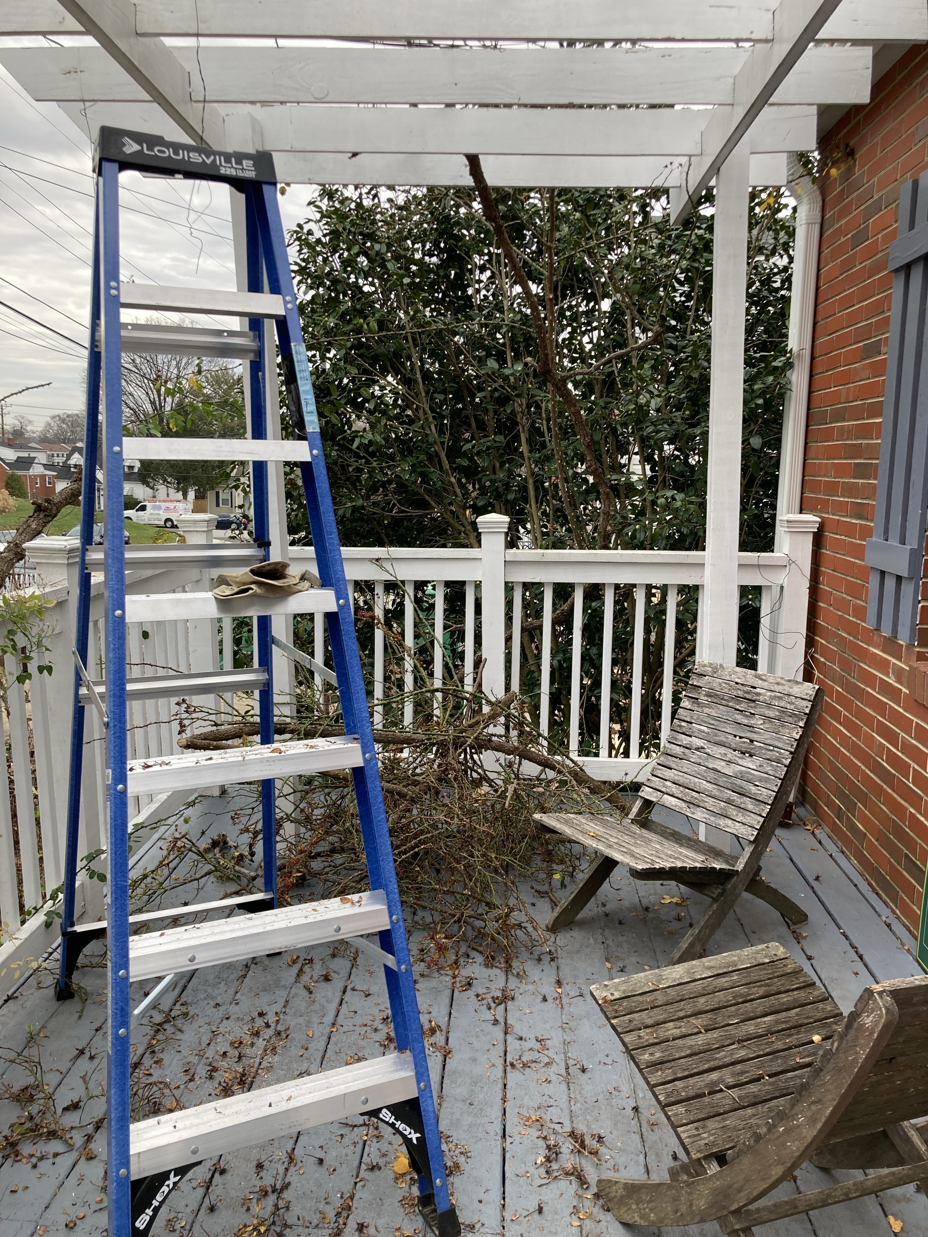 A nice winter day means ladder time – time for pruning, repairing, tying in. And so on this 50 degree day in the post Christmas pause I hauled out the ladder and pruned the New Dawn rose on the pergola.