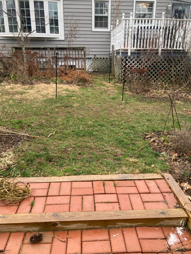 The idea is to have a symmetrical cross shape at the center of the back yard, with the long path (also known as the pitching lane) running parallel to the house, and the brick steps leading up the perpendicular cross.