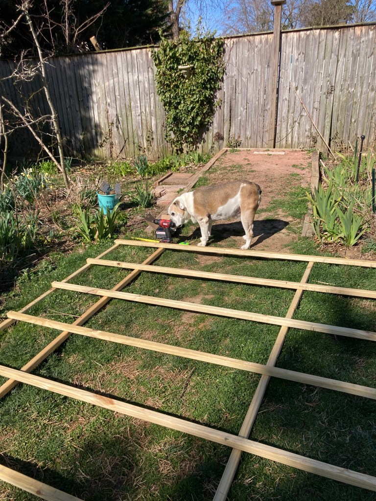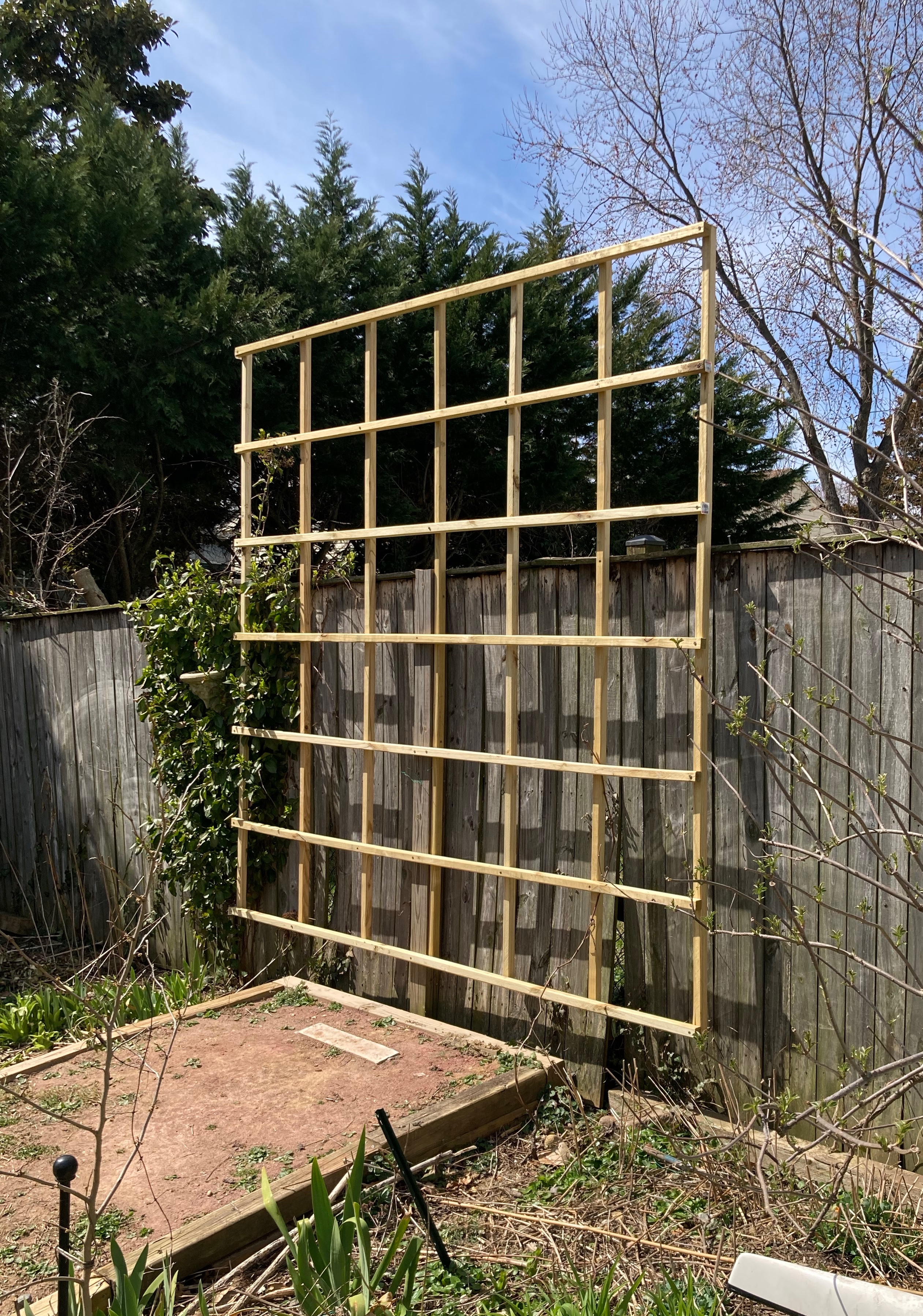 It is Noah’s Spring Break, which means he is playing baseball and I am building stuff in the backyard. A few years ago it was the little bridge over the rain garden, last year it was the brick steps, and this year it is a massive trellis.