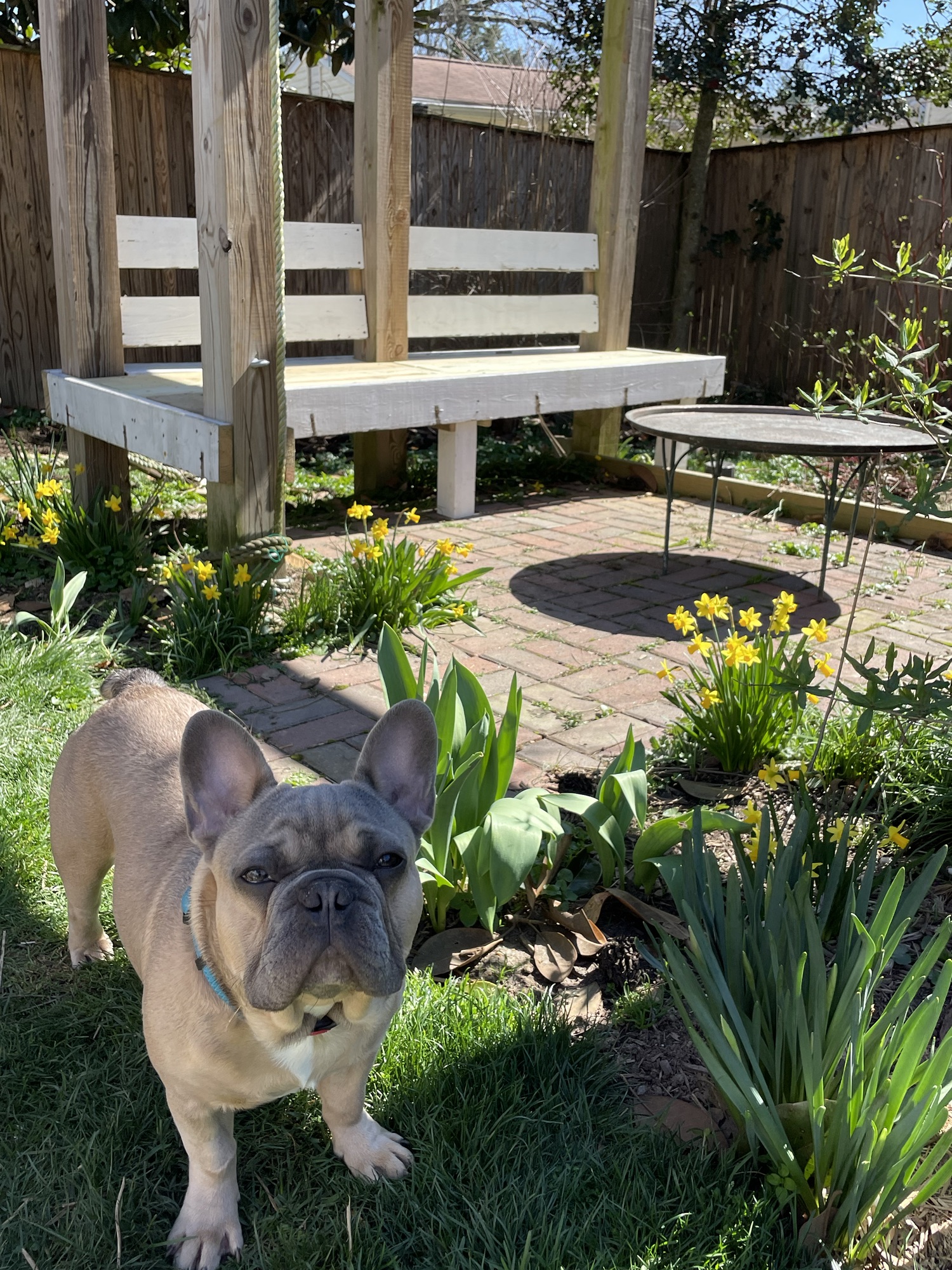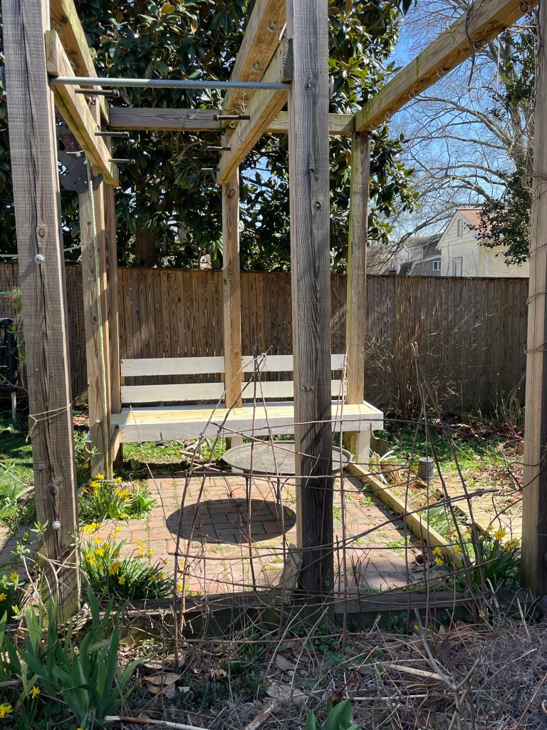 I had that pile of lumber from taking down the pergola, so now I have a bench.