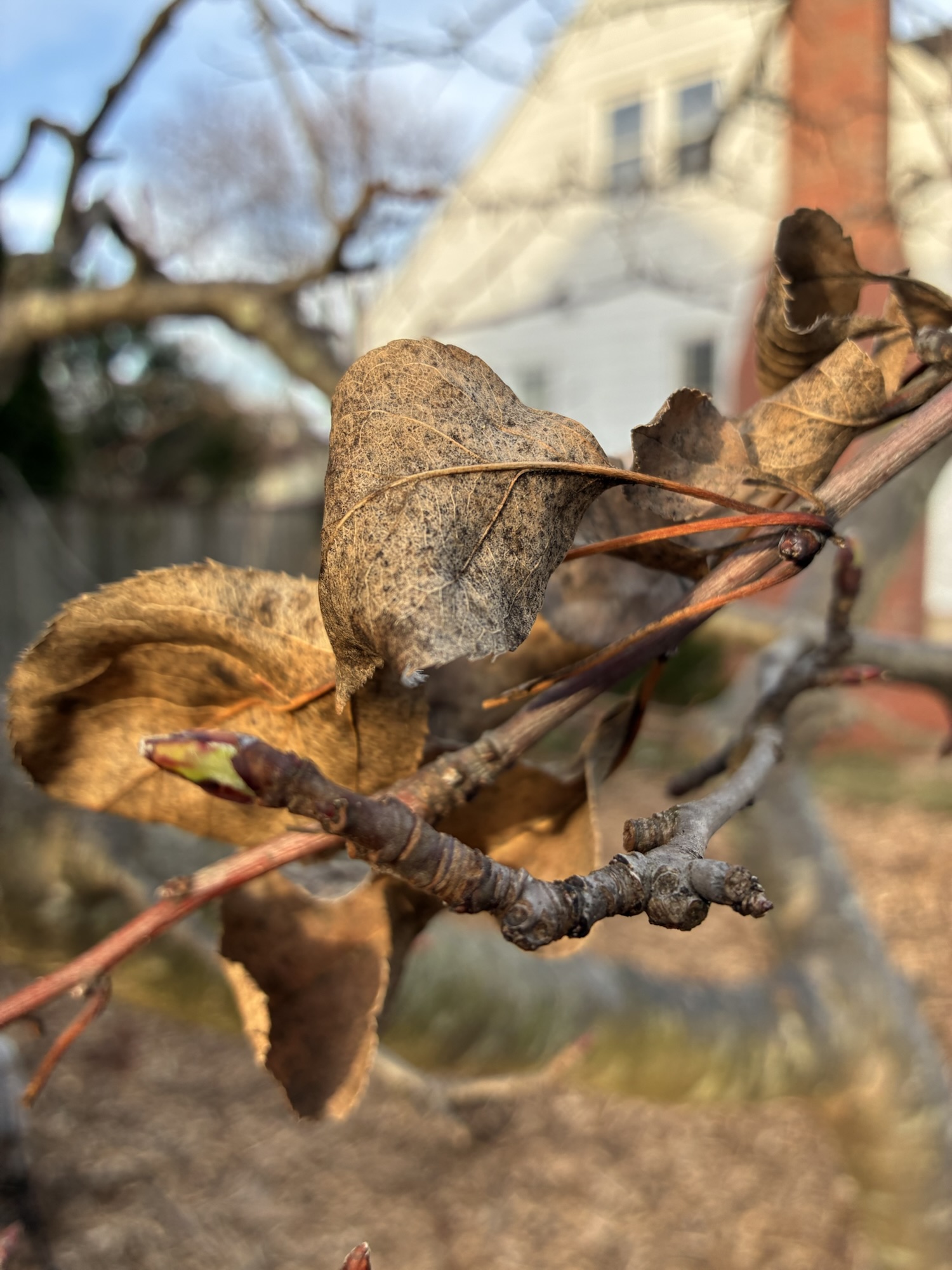 There are small red buds on the crab apple tree, which means spring is here. Admiring the buds, I noticed a branch that still has last year’s leaves. The rest of the tree is bare, and this one branch is still adorned with shriveled brown leaves. Why?